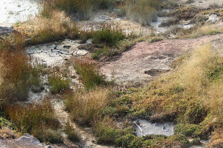 Our last morning at Yellowstone brought us to the South entrance. This would be the way we would leave the Park. But before heading south, we veered slightly to the East to the West Thumb Geyser Basin. It is adjacent to the Yellowstone Lake. There are three tiny geysers/springs that are IN the lake...The Big Cone, The Fishing Cone and The Lakeshore Geyser. And Lakeside Spring. There are three other geysers, some fumaroles, several springs and pools and the Thumb Paint Pots. A potion of the boardwalk trail is 1/4 mile. The longer loop is 1/2 mile. Yellowstone Lake is the largest lake at a high elevation (over 7,700 feet). The Lake is approximately 14 x 20 miles with a shoreline of 141 miles. The maximum depth is 410 feet. Despite the release of thermal hot water, the lake's average summer temperature is 45 degrees (F). Although we did not see them, it is a favorite place for trumpeter swans and moose.